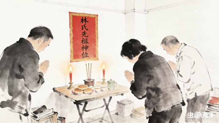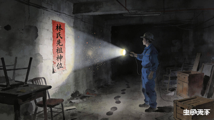 莫得讲演,但我的手电光扫到墙上一张肃清的红纸,上头用羊毫写着:“林氏先祖神位”。